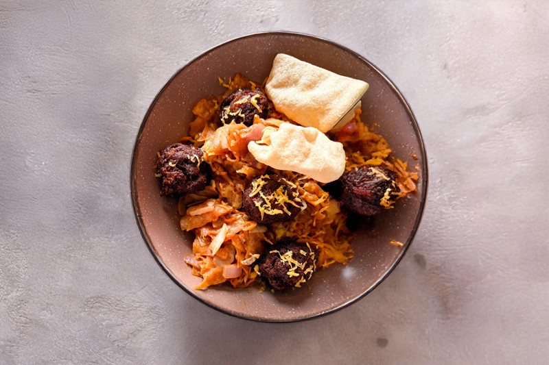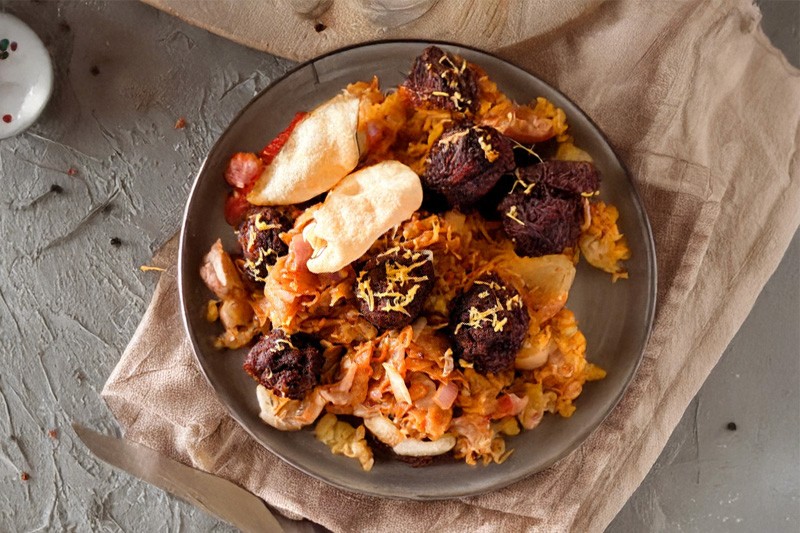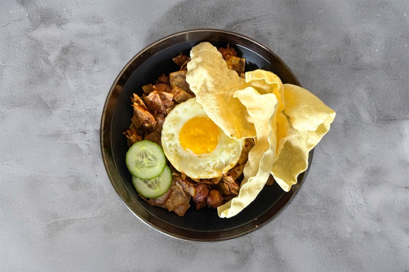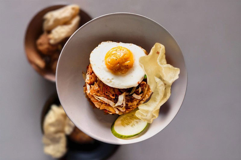 An authentic Maldivian breakfast with Chicken Kulhimas, Mashuni, Roshi, and your chice of egg.